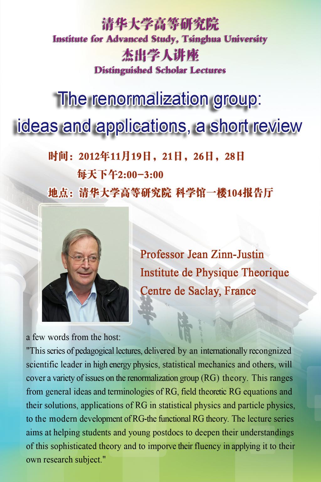 "This series of pedagogical lectures, delivered by an internationally recongnized scientific leader in high energy physics, statistical mechanics and others, will cover a variety of issues on the renormalization group (RG) theory. This ranges from general ideas and terminologies of RG, field theoretic RG equations and their solutions, applications of RG in statistical physics and particle physics, to the modern development of RG-the functional RG theory. The lecture series aims at helping students and young postdocs to deepen their understandings of this sophisticated theory and to imporve their fluency in applying it to their own research subject."